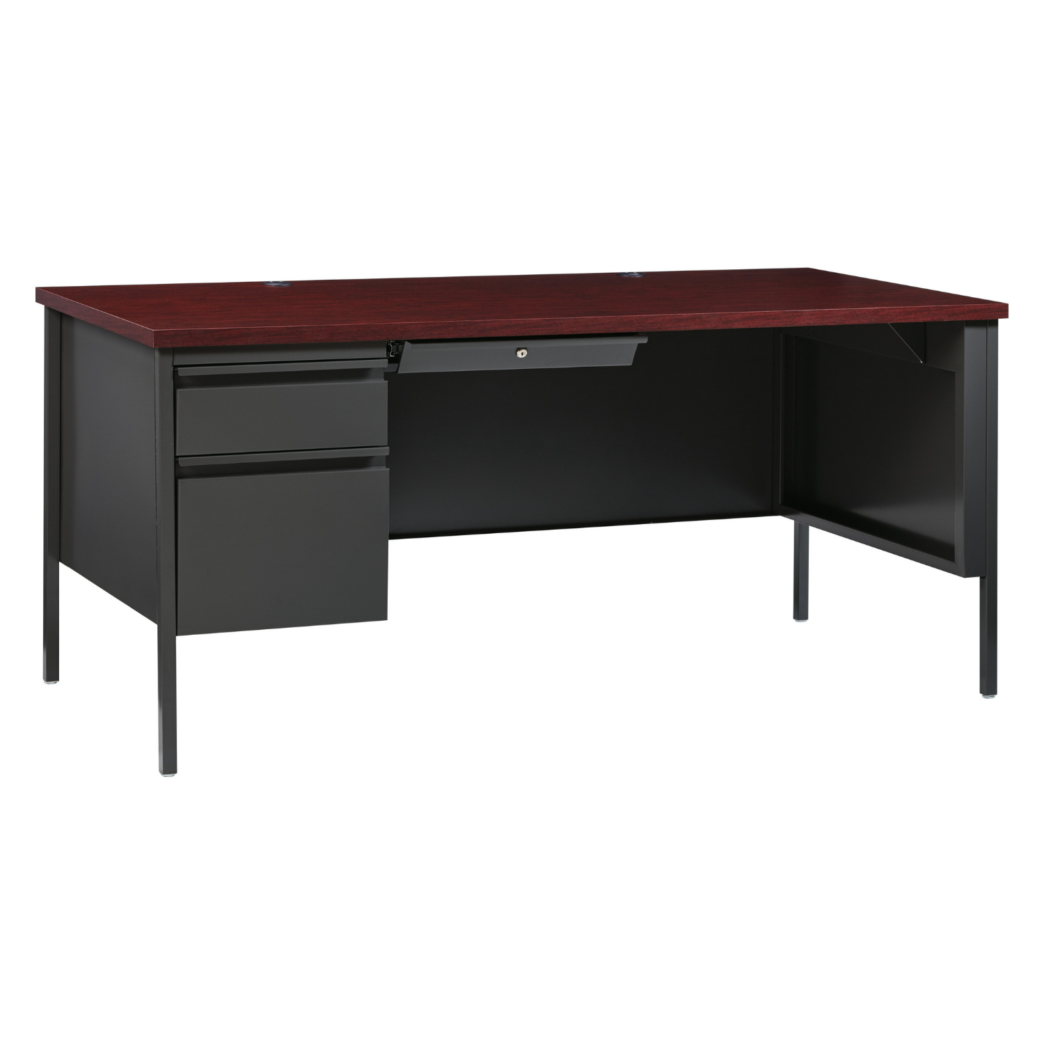 Modular double pedestal desk. Includes a core removable lock and Central locking system. Box and file drawers feature full extension slides and premium satin nickel Arch pull handles. Precision ball-bearing suspension. Durable laminate work surface with grommet holes for cord management. Radiuses profile edge banding for enhanced comfort. Full height end panels with leveling glides. One pencil tray standard per desk and one drawer divider standard per box drawer. Meets or exceeds ANSI-BIFMA standards and contains up to 28percent recycled material.
